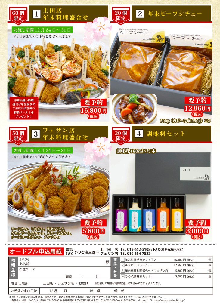 年末料理盛合せ、ギフト商品のお知らせ 今年も毎年ご好評いただいております「年末料理盛合せ」ならびに「ギフト商品」のご予約を開始いたしました。とんかつを中心に、年越しの食卓を彩る特別なお料理をご用意しております。ご家族やご友人との団らんのひとときにぜひご利用ください。ご予約はお電話または店頭にて承ります。一年の締めくくりと新年の始まりを華やかに彩るお料理として、皆さまのご用命をお待ちしております。 【販売店舗】ハレの日の陽食屋 むら八(上田店)、とんかつ専門店むら八(フェザン店)