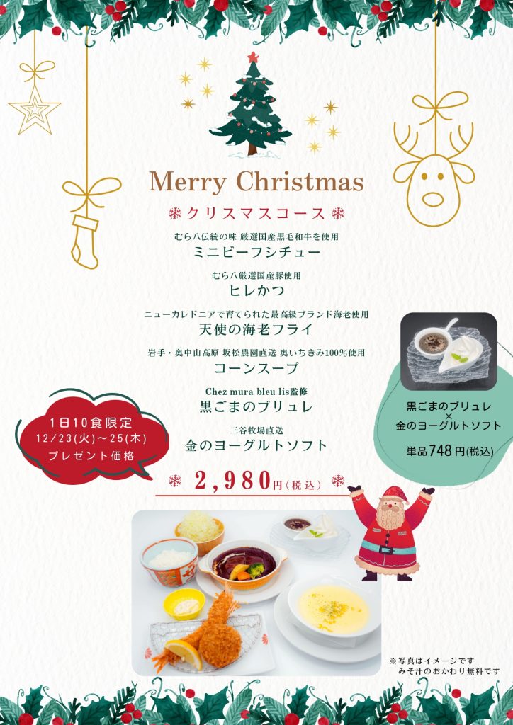 【期間限定】クリスマスメニューのお知らせ 日頃よりご利用いただき、ありがとうございます。当店では、クリスマス期間限定の特別メニューをご用意いたしました。ご家族やご友人との大切なひとときに、ぜひご利用ください。✼••┈┈┈┈┈┈┈┈┈┈┈┈┈┈••✼・.❅1日限定10食❅.・クリスマスコース 価格2,980円(税込)✼••┈┈┈┈┈┈┈┈┈┈┈┈┈┈••✼【販売期間】2025年12月23日(火)~25日(木) なくなり次第終了【販売店舗】ハレの日の陽食屋むら八(上田店)