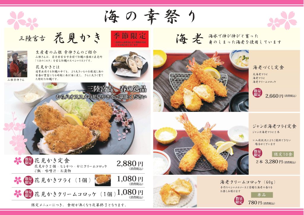 【季節限定】海の幸祭りのお知らせ 旬の海の幸を贅沢に味わえる、期間限定メニューをご用意しました。濃厚でクリーミーな花見かきや、ぷりっとした海老、人気のクリームコロッケなど、この時期ならではの美味しさをお楽しみいただけます。定食から単品まで、幅広くご用意しております。ぜひこの機会にご賞味ください。※食材の入荷状況により、ご提供できない場合がございます※限定メニューにつき、食材がなくなり次第終了となります提供店舗:ハレの日の陽食屋むら八 上田店提供期間:2026年4月3日(金)~ ※入荷次第ご提供